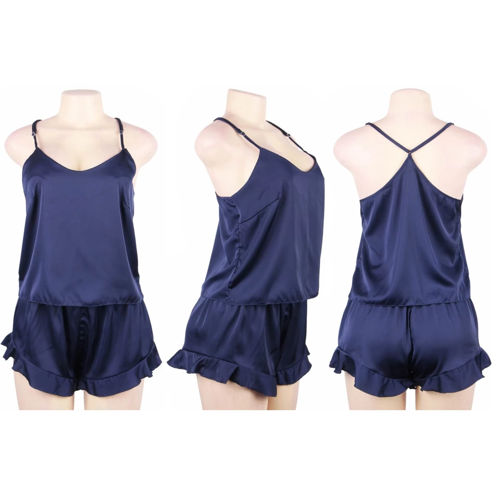 Set de lenjerie erotica rafinat, sub forma de pijama, compus din top si pantaloni scurti cu design sexy si incitant. Este realizat din satin delicat, un material extrem de catifelat care se aseamana cu matasea.
