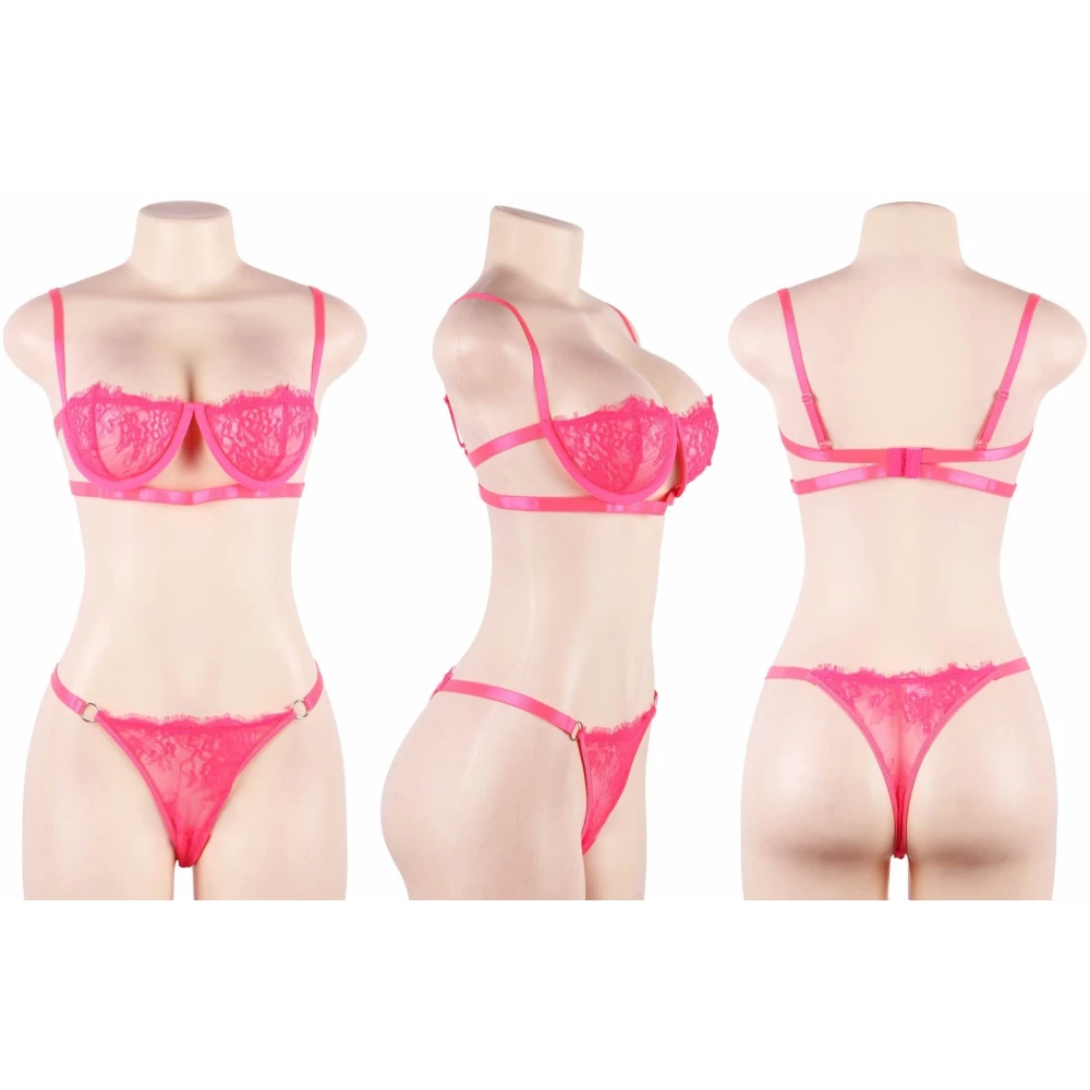 Set de lenjerie erotica, compus din sutien si bikini cu design sexy si incitant. Este realizat din material fin care se simte foarte placut la contactul cu pielea. Materialul are un aspect elegant stil dantela fina cu insertii de modele florale.