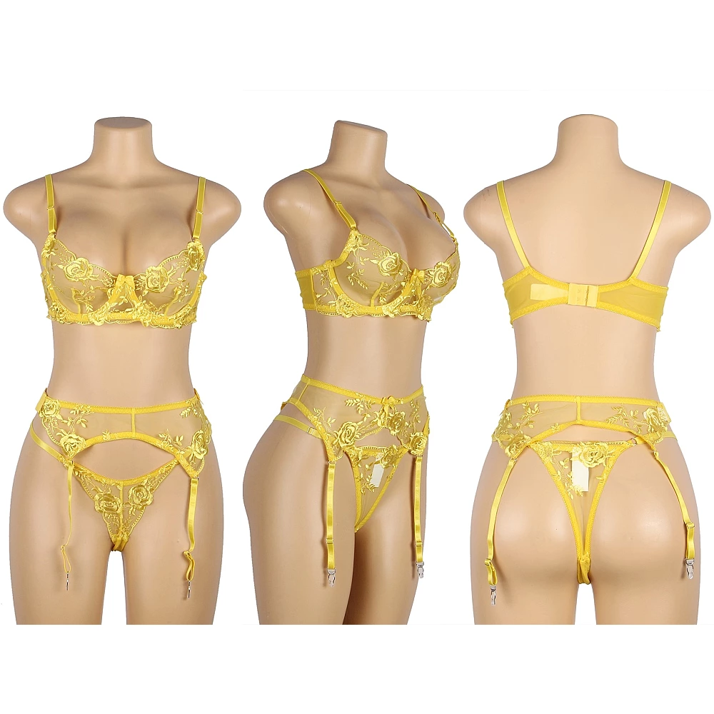 Set feminin de lenjerie erotica cu portjartier inclus, realizat intr-un design sofisticat dar totodata gingas si sexy. Aspectul primavaratic este dat de modelul floral al broderiei dispusa pe toate cele 3 piese care compun ansamblul dar si de nuanta placuta de galben.