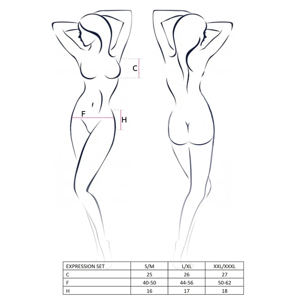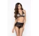Set format din top, fusta mini si slip asortat. Top-ul este confectionat din material tip plasa cu insertii din piele ecologica si aplicatii metalice. Are sistem de prindere la spate si la baza gatului si decolteu adanc in forma de V.