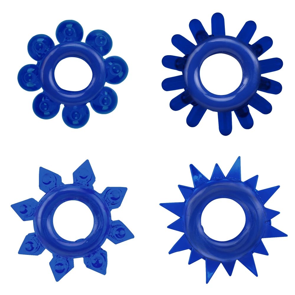 Set format din 4 inele fara vibratii pentru penis, prevazute cu modele reliefate ce dau un plus de senzatie si placere. Sunt special create pentru mentinerea erectiei si intarzierea ejacularii.