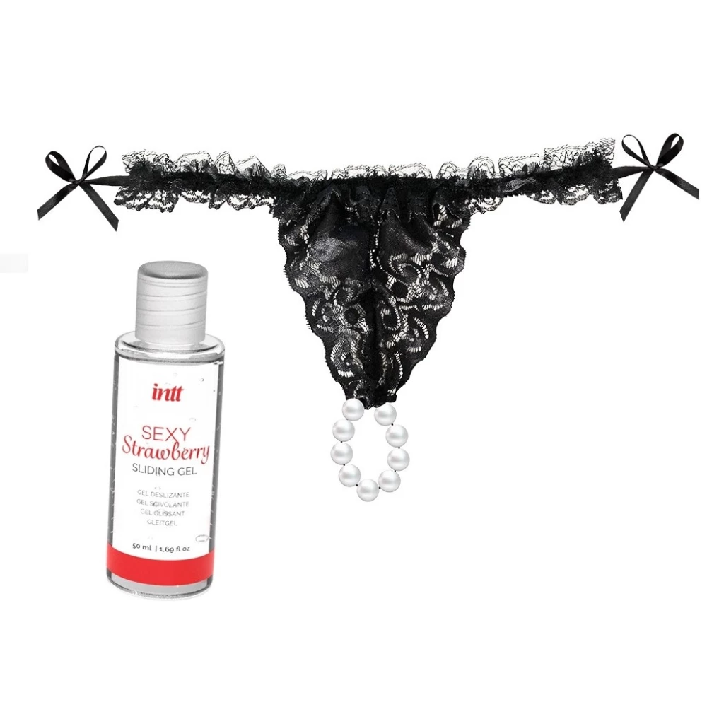 Set format dintr-un slip negru brazilian prevazut cu perle in zona intima si un lubrifiant pe baza de apa, cu aroma delicioasa de capsuni.