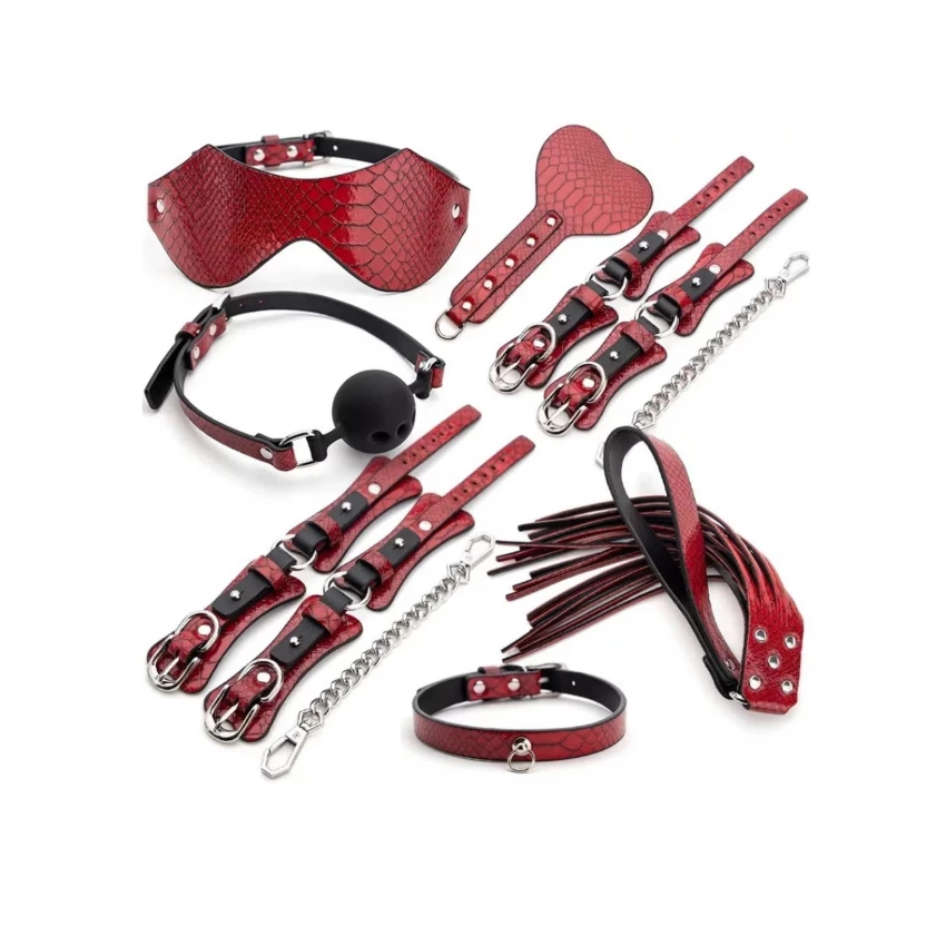 Kitul include multiple accesorii cum ar fi catuse pentru incheietura mainii, catuse pentru glezne, calus, masca si zgarda. Acestea dispun de inchidere pe baza de catarama metalica argintie, ceea ce permite ajustarea functie de circumferinta fiecarei zone pe care urmeaza a fi aplicate.