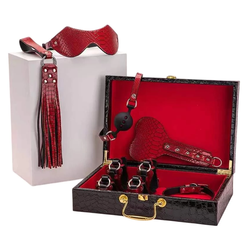 Set format din 8 accesorii bondage, realizate intr-un design uimitor si atractiv din materiale de inalta calitate ce se simt extrem de placut in contact cu pielea. Articolele sunt ambalate int-o cutie eleganta si extrem de practica care va permite o depozitare cat mai eficienta si sigura a lor. Aceasta este de tip servieta cu maner auriu si este asortata perfect cu accesoriile incluse in set.