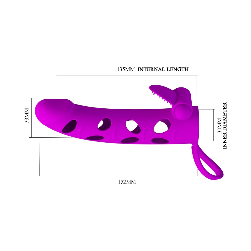Manson pentru penis prevazut cu vibratii. Mansonul este confectionat din silicon de cea mai inata calitate. Este prevazut cu inel pentru testicule, urechiusa pentru stimularea clitorisului si glont vibrator detasabil. Glontul vibrator functioneaza pe baza de baterii tip LR41, care sunt incluse.