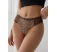 In partile intime, slipul dispune de imprimeu de culoare bej cu cercuri neuniforme maro, imprimeu ce se aseamana cu pielea de leopard. Acest material se continua in laterale cu benzi late din dantela care practic fac legatura dintre partea frontala si cea dorsala, completand intr-un mod special si atractiv intregul design.