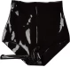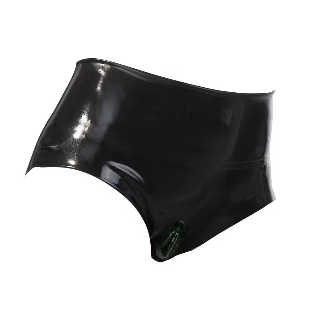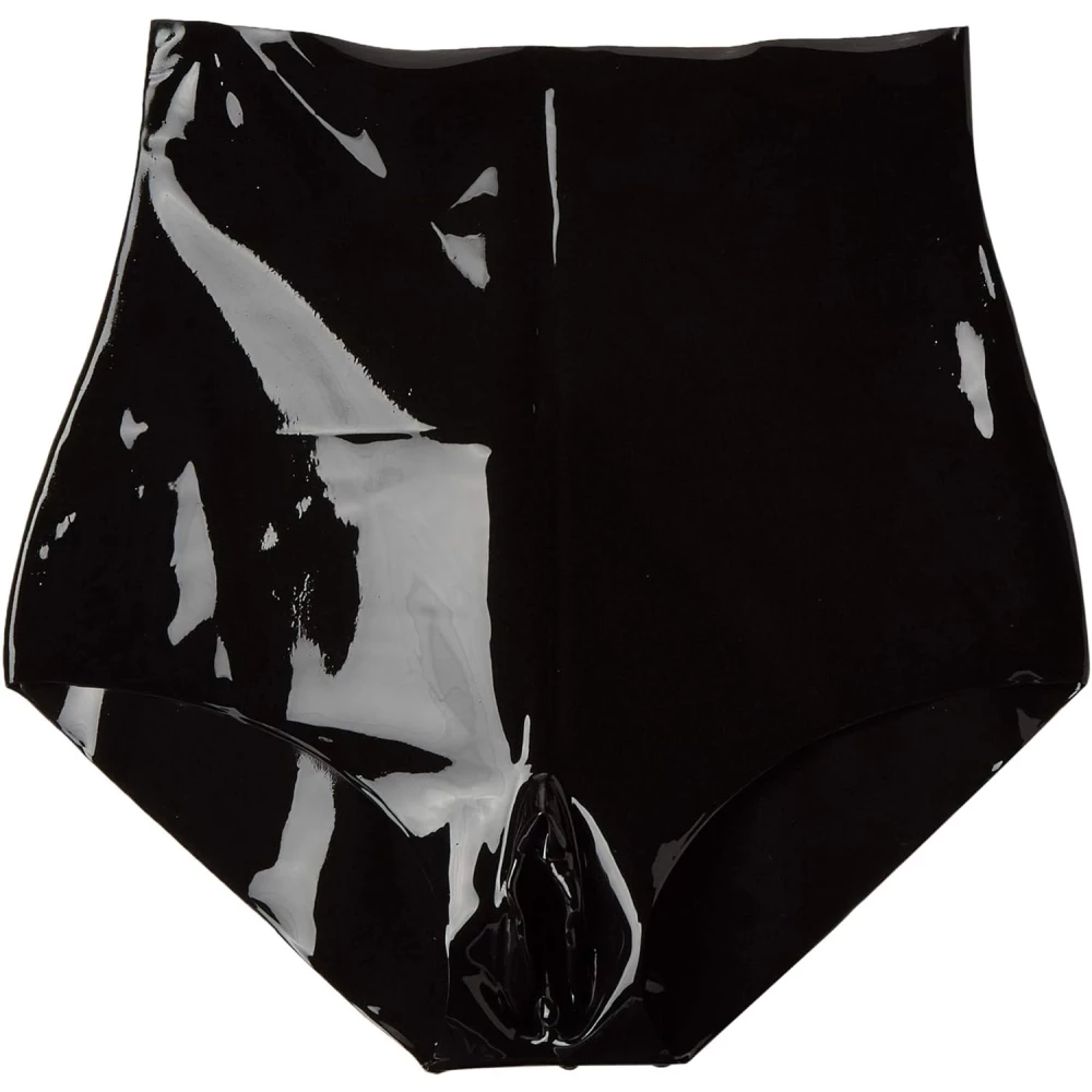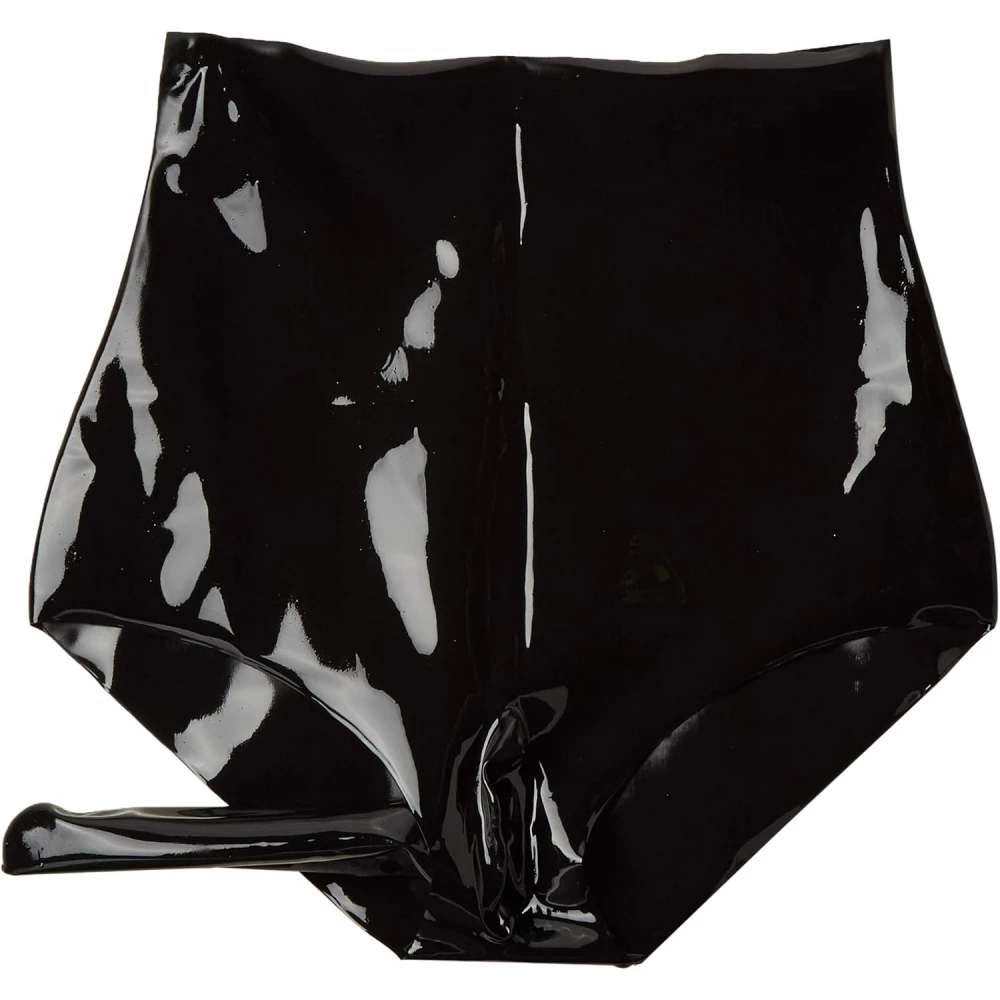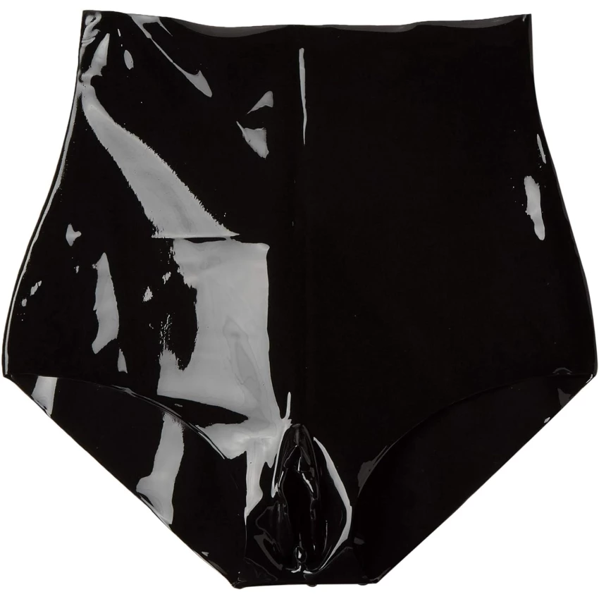 Slip negru confectionat din latex cu aspect lucios, avand labii preformate si un tunel vaginal integrat in zona intima ce faciliteaza penetrarea.