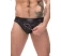 Slip negru model tanga pentru barbati. Este realizat din material semi- transparent cu model abstract. Dispune frontal de un fermoar functional, asezat pe diagonala. Bata lata din talie are aspect "wet".