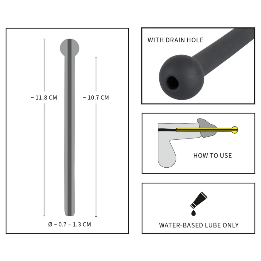 Sonda uretrala cu interior gol, fabricata din silicon de inalta calitate, foarte fin si placut la atingere. Este potrivita pentru practicile fetish sau BDSM de tip edging si explorare senzoriala extrema ce implica dilatarea uretrei barbatilor. Este creata intr-o nuanta clasica de negru si are un diametru maxim de aproximativ 0.7 centimetri.