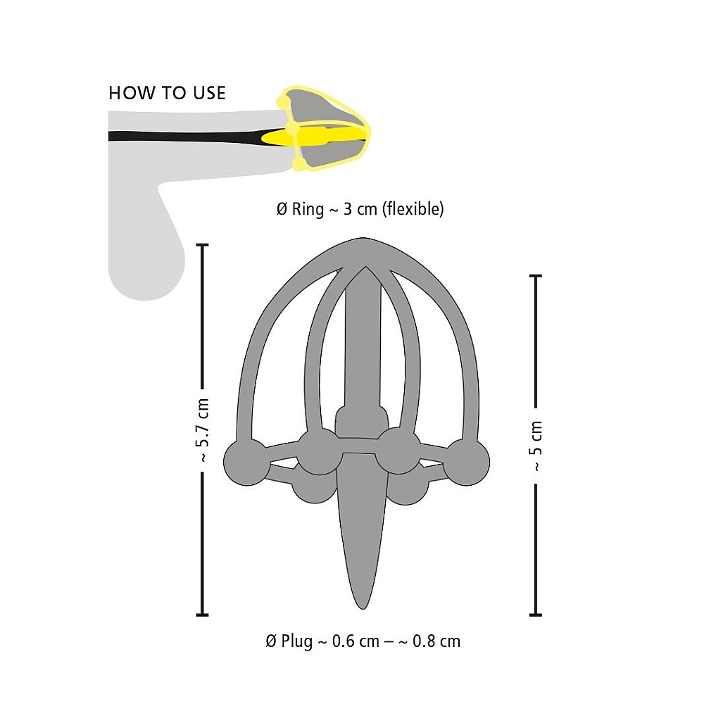 Sonda uretrala prevazuta cu inel pentru gland, cu design tip cusca ce stabilizeaza sonda in timpul utilizarii. Aceasta este prevazuta cu bile ce ajuta la stimularea glandului.