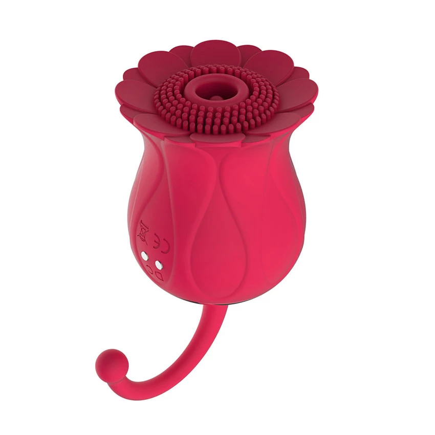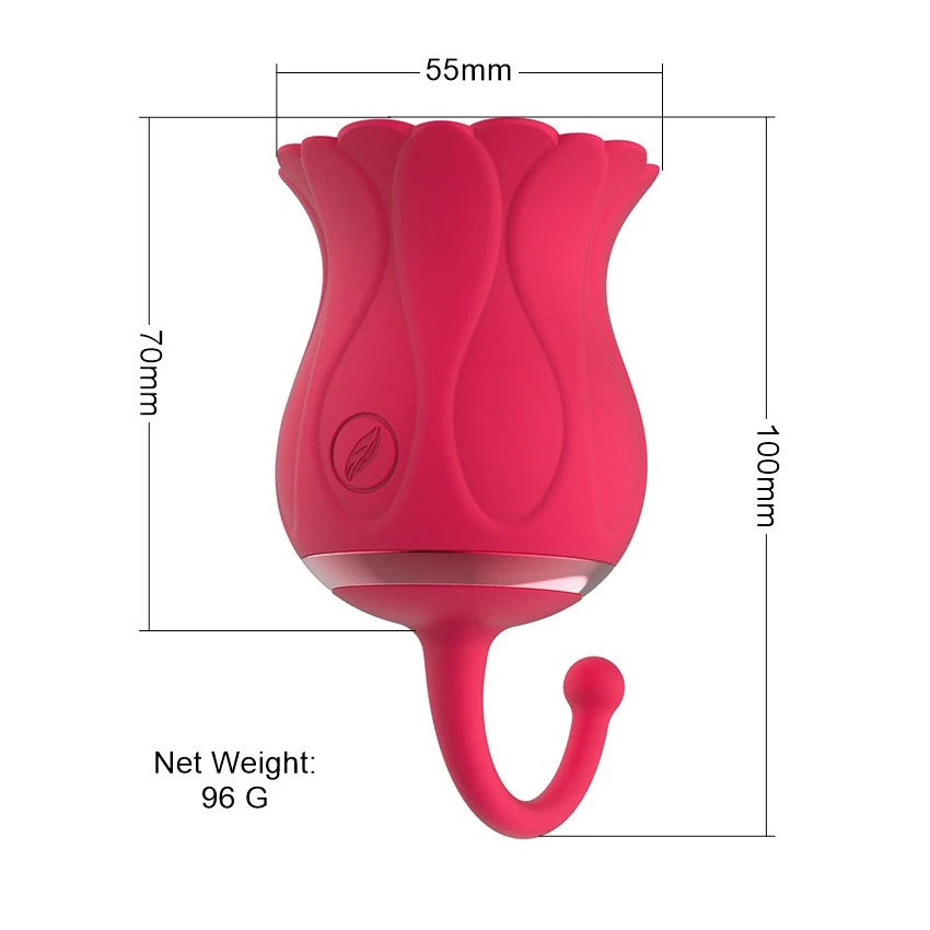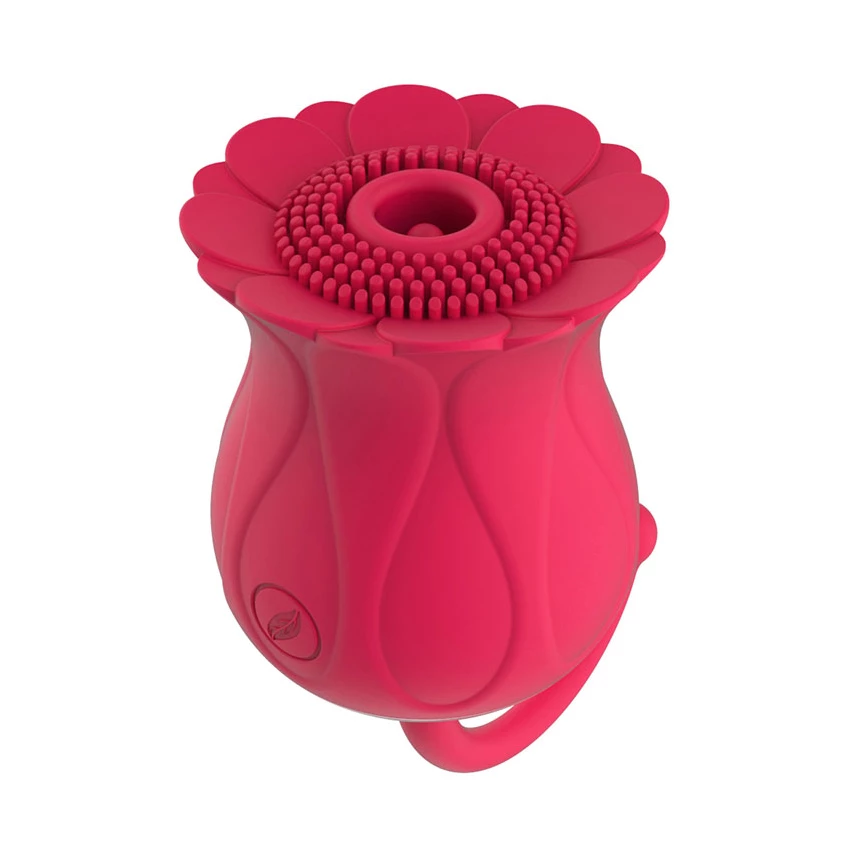 Stimulator cu design in forma de trandafir, confectionat din silicon medicinal neted si catifelat la atingere, dotat cu cili si limbuta ce stimuleaza clitorisul, sanii sau orice zona erogena.