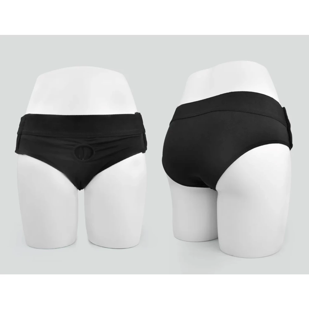 Slipul este confectionat din material textil ce se simte delicat pe piele si este prevazut cu banda lata pe talie,  cu sistem de inchidere tip velcro (cu scai). In partea frontala dispune de un decupaj prin care se introduce dildo-ul.