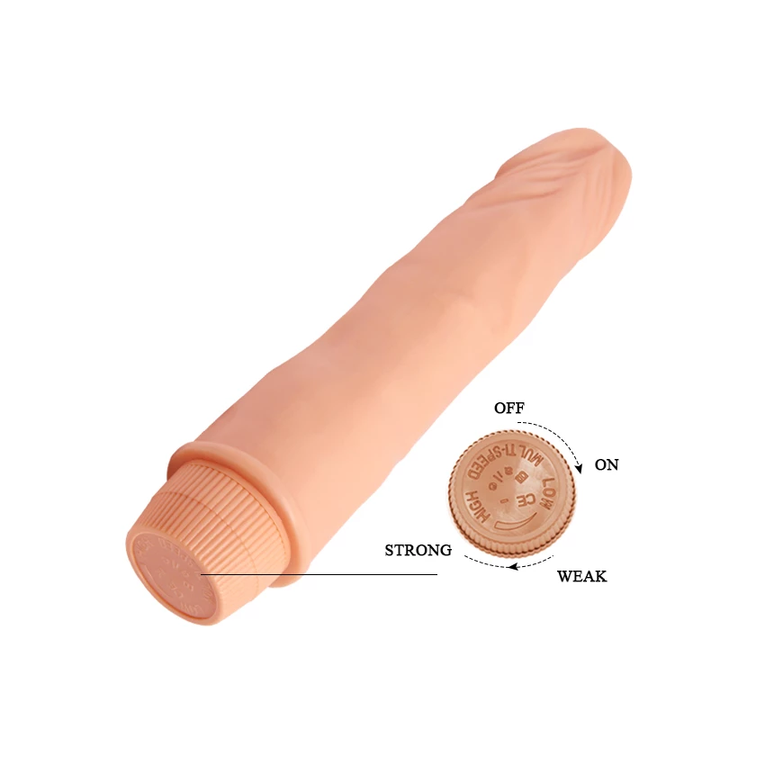 Vibrator realistic prevazut cu vene iesite in relief si cu mai multe trepte de vibratii, pentru o stimulare intensa. Functioneaza cu 2 baterii de tipul AA, care se achizitioneaza separat.