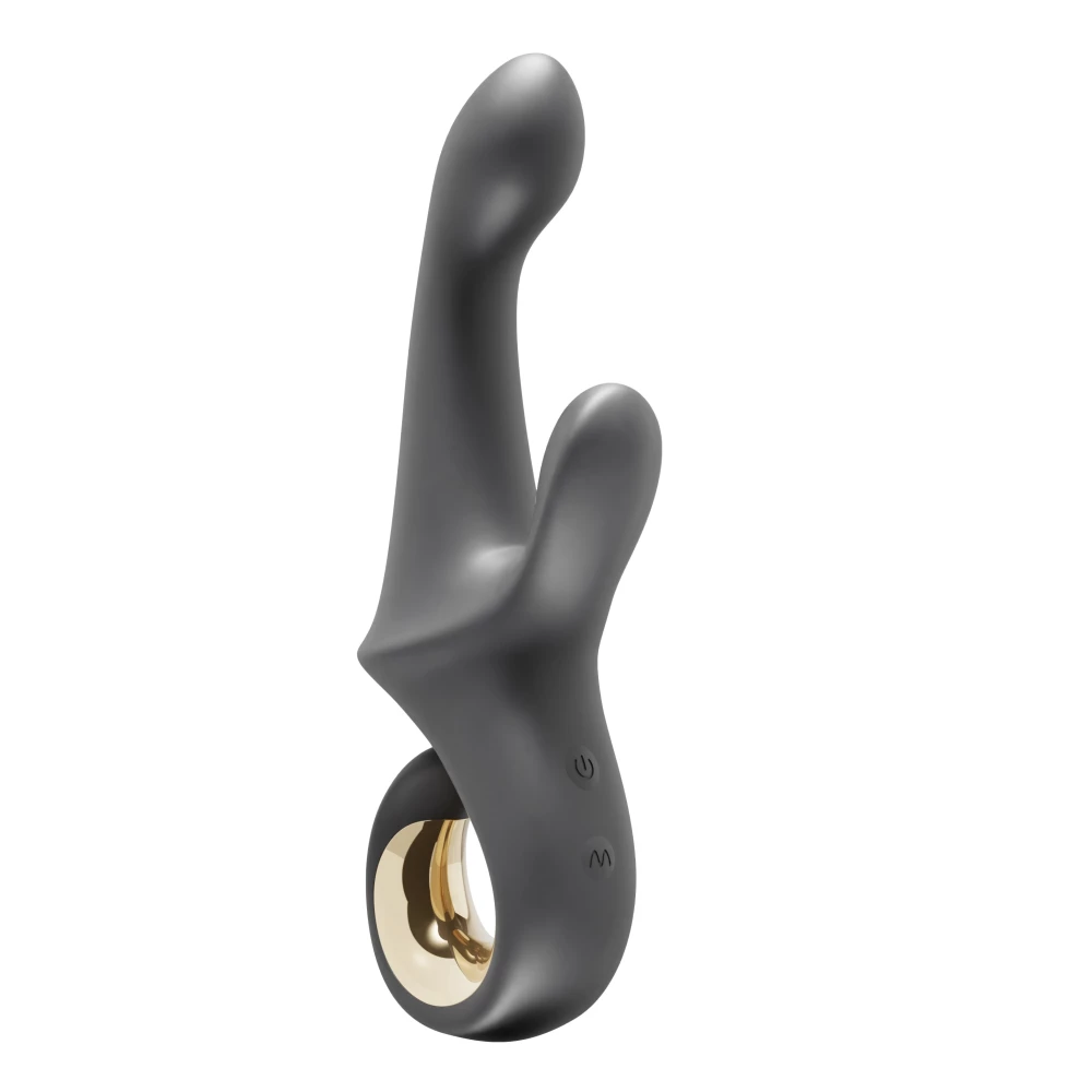 Vibrator cu suprafata din silicon, cu design elegant si forma ergonomica, pentru stimularea simultana a punctului G si a clitorisului. Dispune de maner practic in forma de inel.