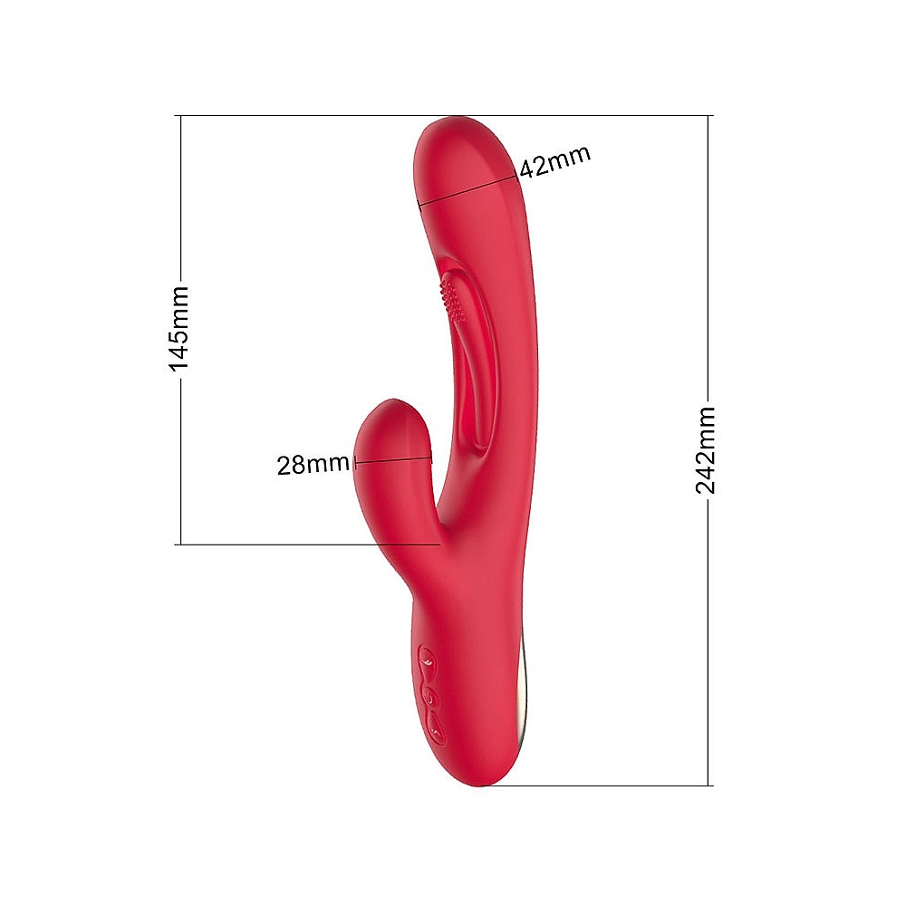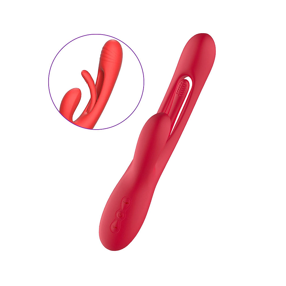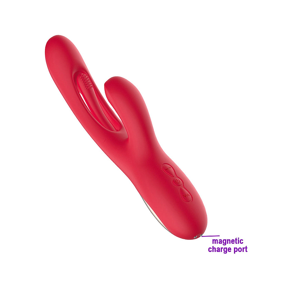 Vibrator rabbit din silicon, realizat cu un design elegant in doua nuante de rosu si auriu, potrivit pentru stimularea clitoridiana dar si vaginala. Axul principal este prevazut cu o limbuta cu texturi in relief care executa 7 tipuri de miscari in fata-in spate de tipul unor oscilatii. Forma curbata ajuta la stimularea punctului G.