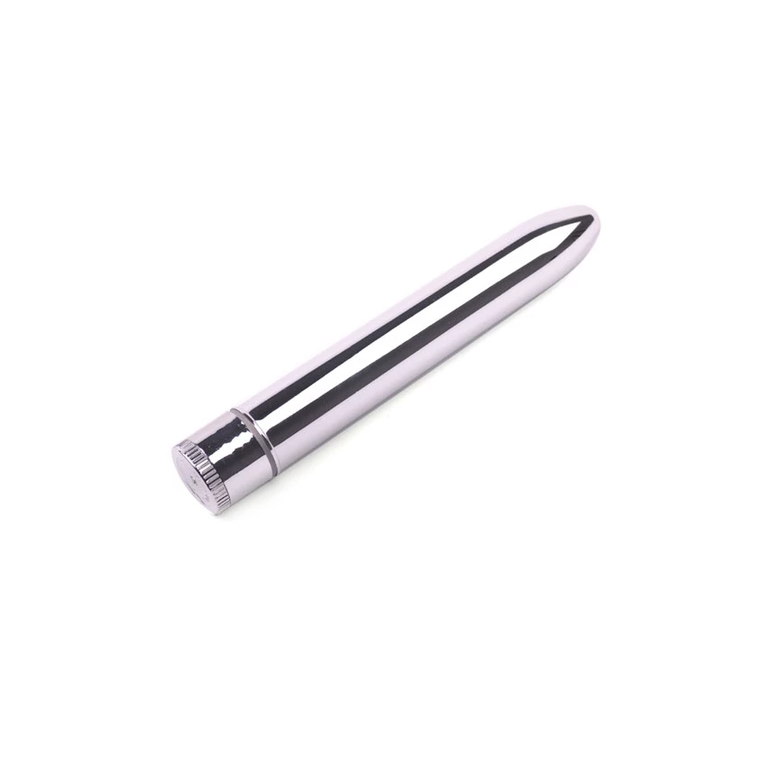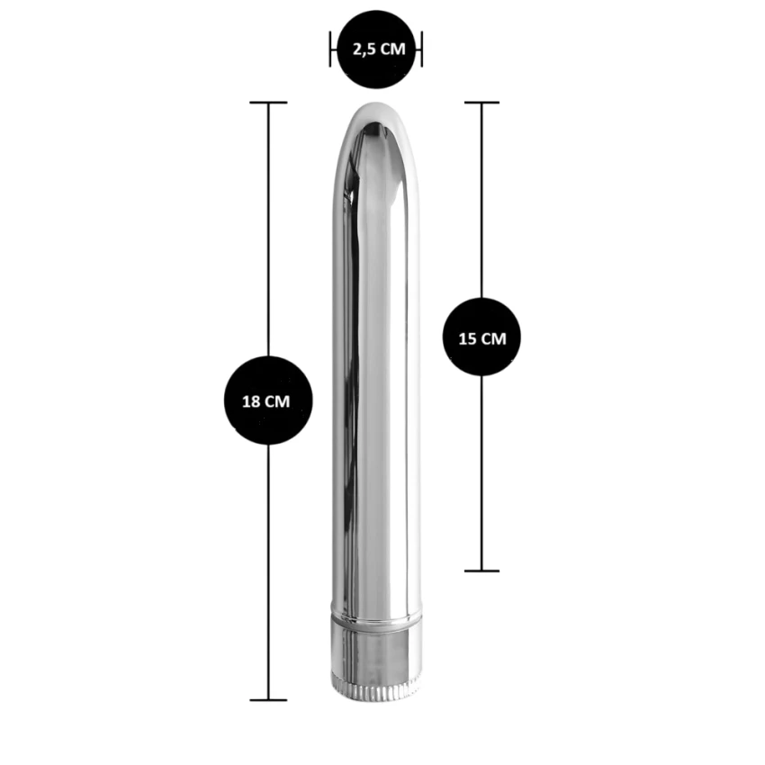Vibrator clasic de culoare argintie, cu suprafata neteda si fina. Dispune de multiple trepte de vibratii, care se actioneaza prin rasucirea capacului de la baza.