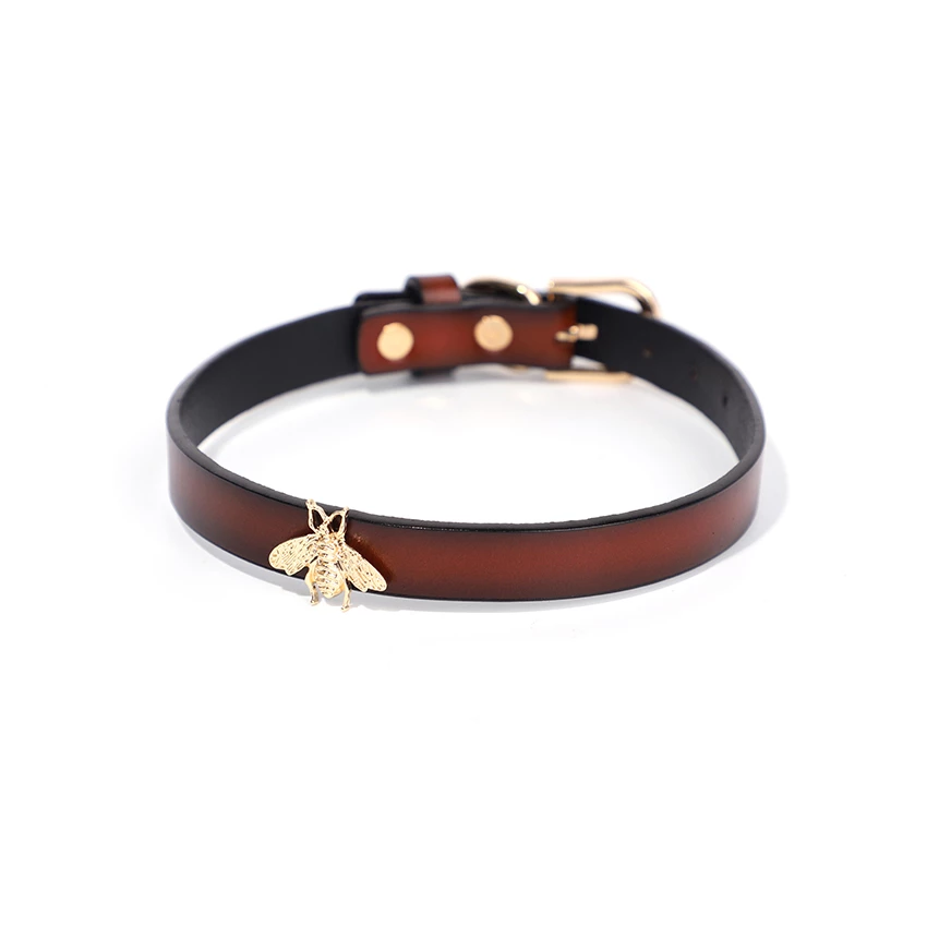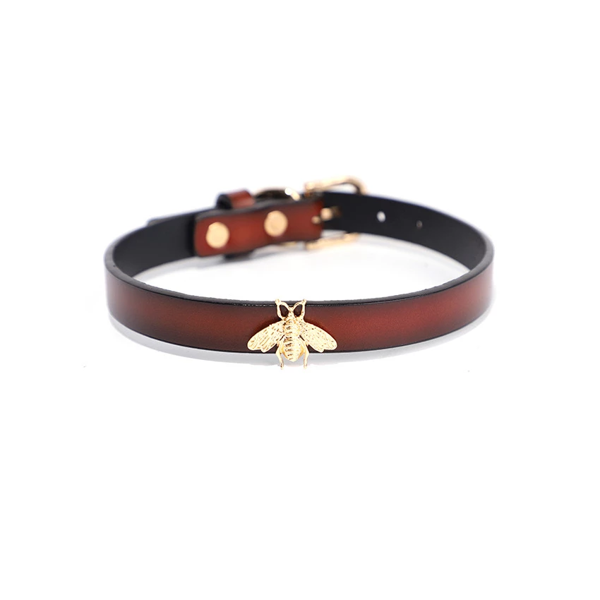 Zgarda de culoare maro cu design special, prevazuta cu aplicatie eleganta de tip insecta aurie dispusa frontal. Se simte fin si matasos la contactul cu pielea din zona gatului, avand un material flexibil ce ofera o purtare confortabila si placuta.