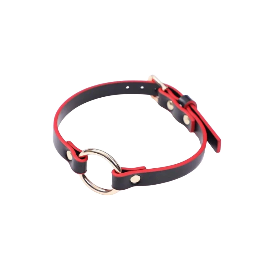 Accesoriu fetish de tip zgarda cu inel frontal, realizata intr-un design elegant intr-un mix al nuantelor de negru clasic, rosu romantic si auriu rafinat. Se simte fin si matasos la contactul cu pielea din zona gatului, avand un material flexibil ce ofera o purtare confortabila si placuta.