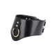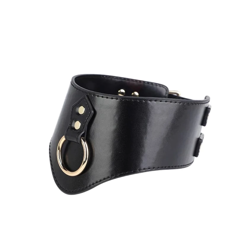 Articol fetish sofisticat de tip zgarda lata cu lesa, realizat din material ce imita pielea ecologica, accesorizata cu inel frontal metalizat de tip O-ring. Zgarda are model in V iar suprafata ei prezinta aplicatii de forma unor nituri stil capse fixe, oferindu-se un aspect elegant si atractiv intregului ansamblu.